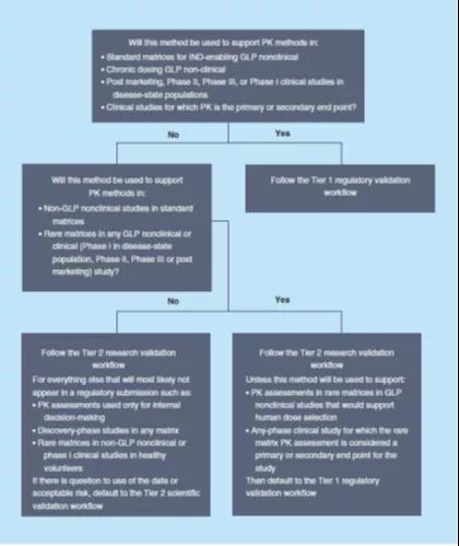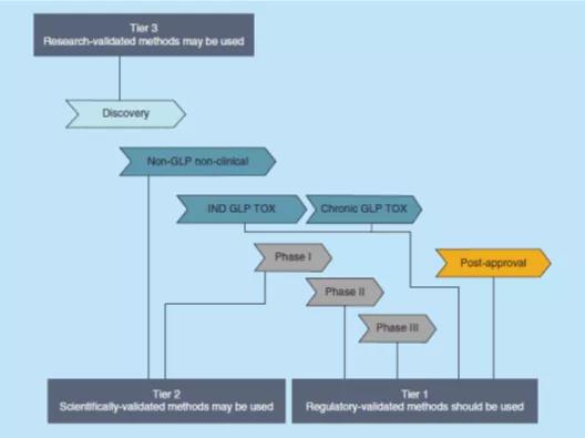 ±ðµÄ£¬µ±PK½«×÷ΪGLP·ÇÁÙ´²»òÁÙ´²Ñо¿µÄÒ»²¿·Ö£¬ÔÚÓÐÊýµÄÉúÎï»ùÖÊ£¨ÀýÈ磬¾«Òº¡¢ÊàŦǻ»¬Òº¡¢ÓÕµ¼Ìµ¡¢¿ÚÇ»ÄÚÊÃÖ½¡¢×éÖ¯¾ùÖÊ¡¢Ö§Æø¹Ü·ÎÅݹàÏ´[BAL]Òº¡¢ÄòÒºµÈ£©ÖоÙÐÐÆÀ¹Àʱ£¬¿ÉÒÔʹÓÿÆÑ§¼¶ÑéÖ¤µÄÆÊÎöÒªÁ죨µÚ2¼¶£¬Tier 2£©£¬ÈçFDAÖ¸Äϲݰ¸ÖÐ˵Ã÷µÄ£¬±¾Ö¸ÄÏ¿ÉÄÜÊÊÓÃÓÚѪҺºÍÄòÒºµÄBA¡¢BEºÍPKÑо¿¡£¹ØÓÚÓÃÓÚÄÚ²¿¾öÒ飨ÀýÈç̽Ë÷ÐÔÑо¿¡¢ºòѡҩÎïµÄÑ¡Ôñ¡¢Åä·½½ÏÁ¿»ò¶ÔÒ©Àí»úÖÆµÄÑо¿£©»ò×÷Ϊ·ÇGLP »òÒ©Îï·¢Ã÷Ñо¿ÖÐʹÓÃÁËÓÐÊý»ùÖʵÄPKÆÀ¹À£¬¿ÉÒÔÓ¦ÓÃÑо¿¼¶ÑéÖ¤ÊÂÇéÁ÷£¨µÚ3¼¶£¬Tier 3£©¡£Í¼1¸ÅÊöÁËÔÚÒ©Î↑·¢µÄ¸÷¸ö½×¶Î£¬¿ÉÒÔÓ¦ÓÃÓÚ¸÷¸ö½×¶ÎµÄÏìÓ¦¼¶±ðµÄÒªÁìÑéÖ¤Á÷³Ì¡£