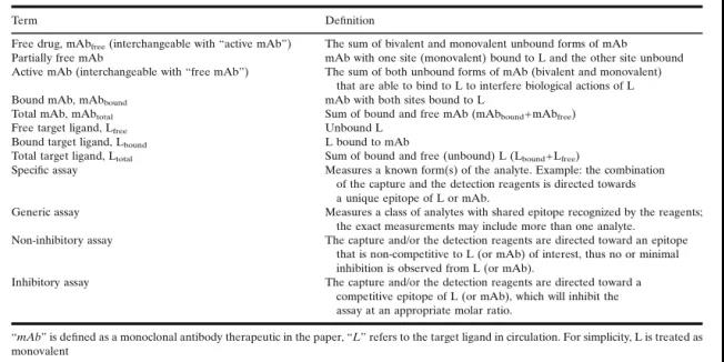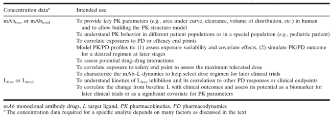 ±¾ÎÄÖ÷Òª¹Ø×¢mAbÉúÎïÒ©ÓëѪҺѻ·ÖÐÒÔ¿ÉÈÜÐÎÊ½ÉøÍ¸³öÀ´µÄ£¬»ò´ÓĤÊÜÌåÉÏÍÑÂäµÄ°Ð±êÅäÌåºÍL¡£±¾ÎÄ´ÓÀíÂÛºÍʵ¼ùÉÏÑо¿ÁËÔõÑù²â¶¨µÄ×ÜÌå/ÓÎÀëµÄ´ý²âÎïŨ¶È£¬ÒÔÌáÉý¿ÆÑ§½çµÄÏà¹ØÈÏÖª£¬²¢ÌṩÁËÏà¹ØÉúÎïÆÊÎöÕ½ÂÔ£¬ÒÔ±ãÔÚÒ©Î↑·¢µÄÌØ¶¨½×¶ÎÌṩËùÐèµÄPK/PDµÄÐÅÏ¢¡£