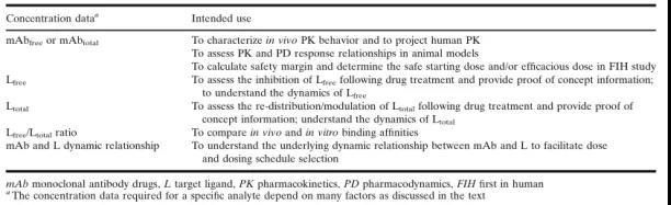 ÔÚÐí¶àÇéÐÎÏ£¬ÉúÎïÒ©µÄÒ©ÀíЧӦÊÇÓÉÓÎÀëµÄmAbºÍmAbfreeËù¾öÒéµÄ¡£ÈôÊÇmAbÓë¿ÉÈÜÐÔÅäÌåÁ¬Ïµ£¬ÒÔ±ÜÃâÆäÓëͬԴÊÜÌåÁ¬Ïµ£¨»òͨ¹ýÆäת´ïÐźţ©¡£ÈôÊÇÄܹ»ÔÚÓÎÀë°Ð±êÅäÌåÓëLfreeµÄÁ¬ÏµÓëÁÙ´²ÏìÓ¦Ö®¼ä½¨ÉèÆðÏà¹ØÐÔ£¬ÓëLµÄÁ¬ÏµºÍ²¶»ñ¾Í¿ÉÒÔ×÷ΪPK/PD½¨Ä£ºÍ¸øÒ©¼Æ»®Ñ¡Ôñʱһ¸öÖ±½ÓµÄÉúÎï±ê¼ÇÎï¡£ËäÈ» mAbfree·´Ó¦ÁËmAbÔÚÌåÄÚµÄÓÎÀë״̬ºÍÁ¬ÏµÄÜÁ¦£¬µ«ÆÀ¹ÀmAbtotal¿ÉÒÔ½øÒ»²½×ÊÖúÐÎòmAbÓëLÖ®¼äµÄ¶¯Ì¬Ï໥×÷Óá£mAb/LµÄ±ÈÖµÓëÆä¶¯Ì¬Æ½ºâ£¨dynamic equilibrium£©¸ß¶ÈÓ°ÏìÉúÎïÆÊÎöÒªÁìµÄÌØÒìÐÔ¡£Òò´Ë£¬ÏàʶҩÎ↑·¢²î±ð½×¶ÎËùÐèµÄÐÅÏ¢ÊÇÊ®·ÖÖ÷Òª¡£