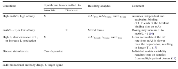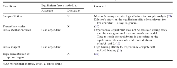 ³ýÁË˼Á¿¸øÒ©ºómAb-LÁ¬ÏµµÄÌåÄÚ¶¯Á¦Ñ§Í⣬ÀëÌå״̬£¨ex vivo conditions£©ÈçÑùÆ·ÊÕÂÞ¡¢Öü´æ¡¢ÔËÊäºÍÑùÌìÖ°ÎöµÈ¿ÉÄÜʹÑù±¾µÄƽºâ״̬ÓëÌåÄÚ£¨in vivo£©×´Ì¬´ó²»Ïàͬ¡£±í5ÁгöÁËһЩ¿ÉÄÜÓ°ÏìÁ¬Ïµ»ò½âÀëÆ½ºâ¶¯Á¦Ñ§µÄ״̬¡£