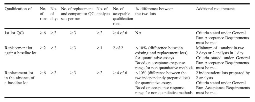 ¿ÉÄܱ£´æÕâÑùµÄÇéÐΣ¬¼´¿ÉÄܲ»±£´æÒÅÁôµÄ£¬¾ÈÏÖ¤¼°¸ñµÄQCÑùÆ·£¬ÓÉÓÚÕâЩQCÑùÆ·ÒѾÓÃÍê»òÓâÆÚ¡£²»±£´æ¿É½ÏÁ¿QCµÄÇéÐÎÏ£¬½¨ÒéʹÓòî±ðµÄÖÐÐÄÔÒº£¨intermediate stocks£©£¬Óɲî±ðµÄÆÊÎöÖ°Ô±£¬»®·ÖÖÆ±¸Á½¸öÅú´ÎµÄQCÑùÆ·¡£´ÓÏÖʵ²Ù×÷ÉÏ£¬¿ÉÒÔÖ¸¶¨Ò»¸öÅú´Î£¬¿ÉÄÜÊÇÅúÁ¿½Ï´óµÄ£¬ÎªÖ÷ÒªÅú´Î£¨primary lot£©£»ÁíÒ»Åú´Î£¬¿ÉÄÜÊÇСÅúÁ¿µÄ£¬¾Í×÷Ϊ²ÎÕÕÆ·£¨comparator£©£¬¶ÔÖ÷ÒªÅú´Î¾ÙÐÐÈÏÖ¤¡£¶ÔÖ÷ÒªºÍ´ÎÒªÅú´ÎµÄ±ÈÕÕ²âÊÔÓ¦ÓÉ2È˾ÙÐУ¬Ã¿ÈËʹÓÃ×ÔÁ¦ÖƱ¸µÄ±ê×¼ÇúÏß¾ÙÐвâÊÔ£¬Ã¿È˾ÙÐÐ3´Î²âÊÔ£¬ÖÁÉÙ·Ö2Ìì¾ÙÐУ¬×ܹ²ÔËÐÐ6´Î¡£ÖÁÉÙ4/6 (2/3)µÄQCÈÏÖ¤ÔËÐÐÓ¦¸ÃÖª×ã½ÓÊܱê×¼¡£Ò²Ó¦Öª×ãÉÏÊöµÄͨÀýÔËÐнÓÊܱê×¼¡£Á½¸öÌæ»»Åú´ÎµÄQCÑùÆ·Ó¦Öª×ã¡À10%»ò¸üÑÏ¿áµÄÎó²î±ê×¼£¬°ü¹Ü¶þÕßÖÐÈκÎÒ»¸öÅú´Î¾ù¿É½ÓÊÜ¡£±í1×ܽáÁËÕâЩÈÏÖ¤ÒªÇó¡£