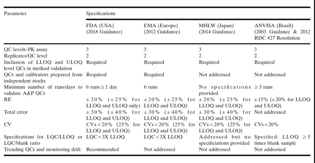 LBA²âÊÔÖеÄQCÑùÆ·£¬Ó¦Í¨¹ýÔÚ¼°¸ñ£¨qualified£©µÄ»ùÖÊÖмÓÈëÒÑ֪Ũ¶ÈµÄ²Î¿¼£¨±È£©±ê׼Ʒ£¨ÓÃÓÚPK¶¨Á¿ÆÊÎö£©£¬»òÏ¡ÊÍ/ŨËõµÄº¬ÓÐÑôÐÔ±ÈÕÕ¿¹ÌåµÄÔ­Òº£¨ÓÃÓÚADA²âÊÔ£©À´ÖƱ¸ ¡£¹ØÓÚQCÑùÆ·µÄ×é³É¡¢Ä¿µÄÖµºÍ½ÓÊܱê×¼µÄͨÓÃÖ¸ÄÏ£¬ÒÑÓÉÏÂÊöî¿Ïµ»ú¹¹Ðû²¼£ºÃÀ¹úFDA£¬Å·ÖÞÒ©¼à¾Ö(EMA)£¬ÈÕ±¾ÎÀÉú²¿£¬ÀͶ¯ºÍ¸£Àû(MHLW)ºÍ°ÍÎ÷ÎÀÉú¼à²ì¾Ö(ANVISA) ¡£±í3×ܽáÁËî¿Ïµ»ú¹¹¹ØÓÚ¶¨Á¿£¨PK£©ÆÊÎöÖÐËùʹÓõÄQCsµÄÖÆ±¸ºÍ×é³ÉµÄÒªÇó ¡£