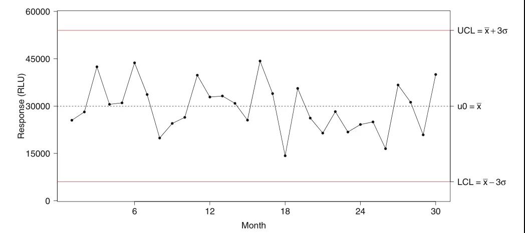ͼ1. Levey-JenningsͼʾÀý ¡£Ë®Æ½ºìÏßΪÏÂ/ÉÏÏÞÖµ£¨lower/upper control limits£¬L/UCL£©£»ÐéÏßˮƽºáÏßΪÊÓ²ìÆ½¾ùÖµ£¨¦Ì0£© ¡£