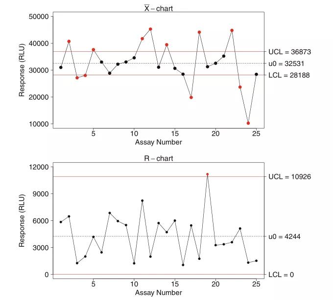 ͼ2. Xbar-RͼµÄʾÀý ¡£Xbarͼ±íÏÔʾÁËÿ¸öʵÑéµÄƽ¾ùÖµ£»µ×²¿ÊÇRͼ£¬ÌåÏÖÿ¸öÆÊÎöµÄÊÓ²ì¹æÄ£ ¡£¹ØÓÚÕâÁ½ÕÅͼ£¬Ë®Æ½µÄºìÏßÊÇÏÂÏÞÖµºÍÉÏÏÞÖµ; ˮƽºÚÏßÐéÏßÊÇʵÑéÖÐÊӲ쵽µÄƽ¾ùÖµ ¡£